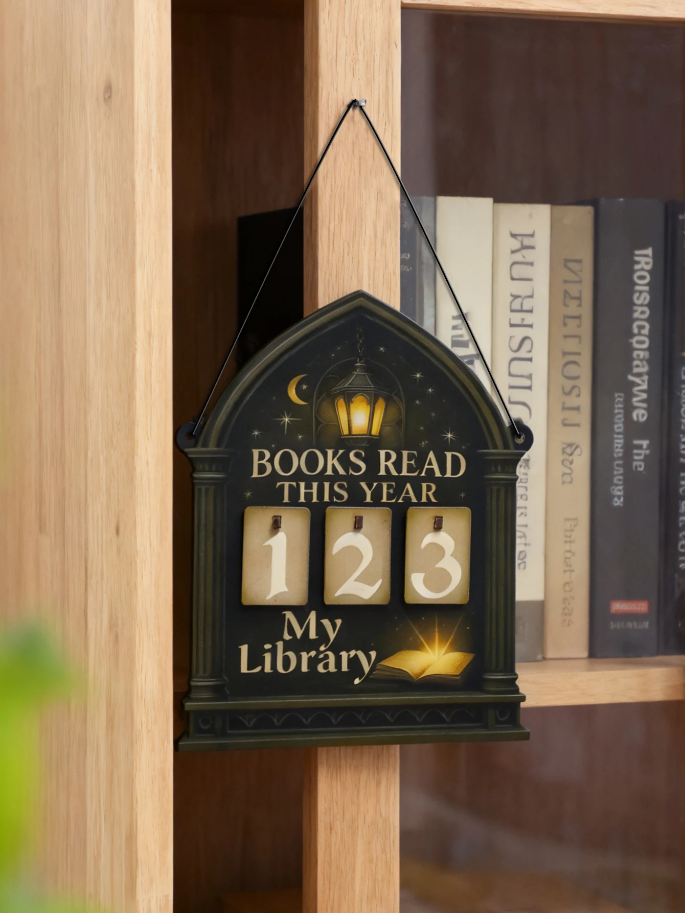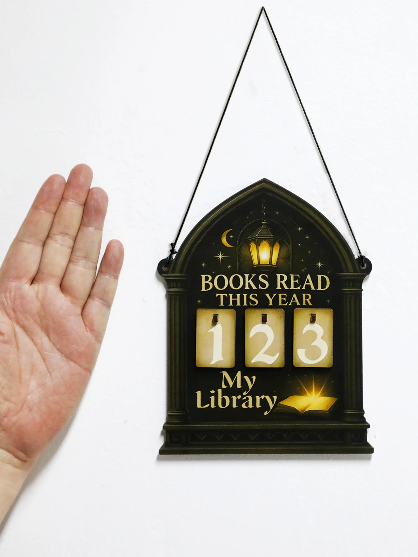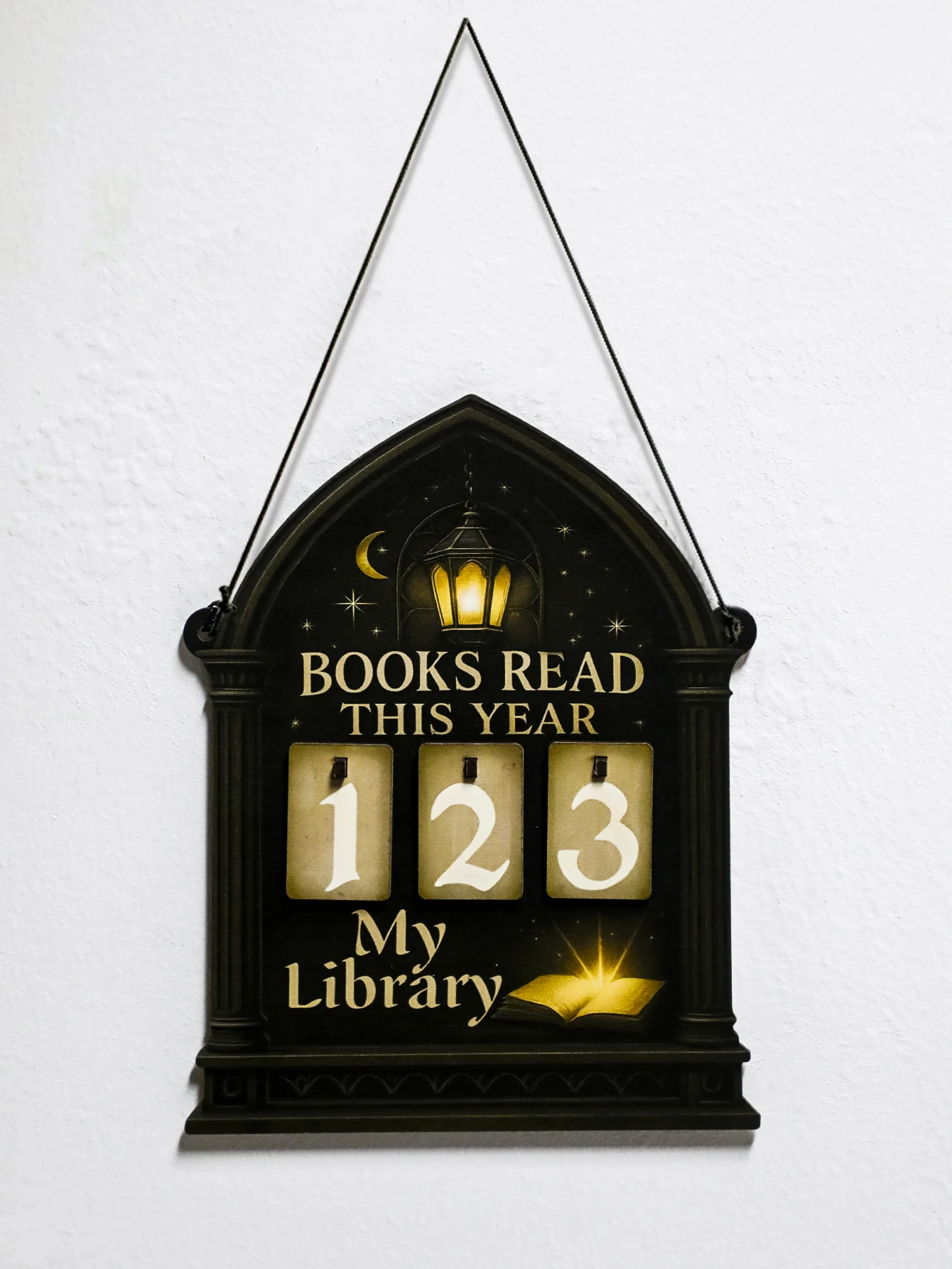 Featuring a unique gothic lantern and moon design, this book tracker sign adds a mystical touch to any library decor.