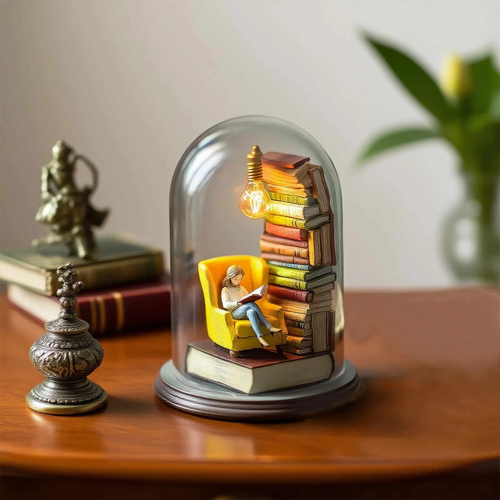 Exquisite Details: The character's home decor, and clothing are meticulously portrayed, while the armchair's sleek lines and colors create a lifelike experience. The book cover and binding are also vividly rendered, while the bulb's shape and warm yellow lighting create a realistic, all-encompassing craftsmanship.