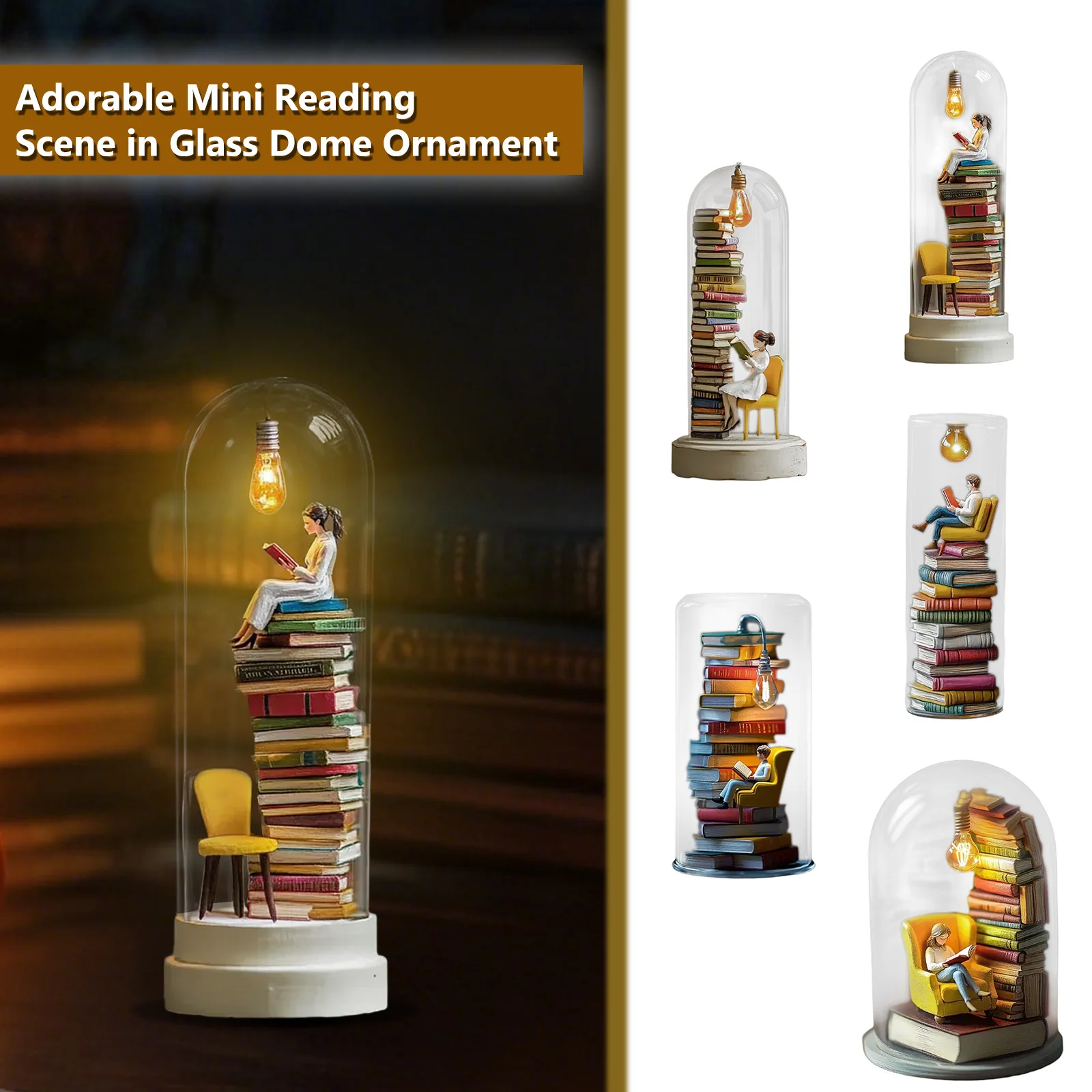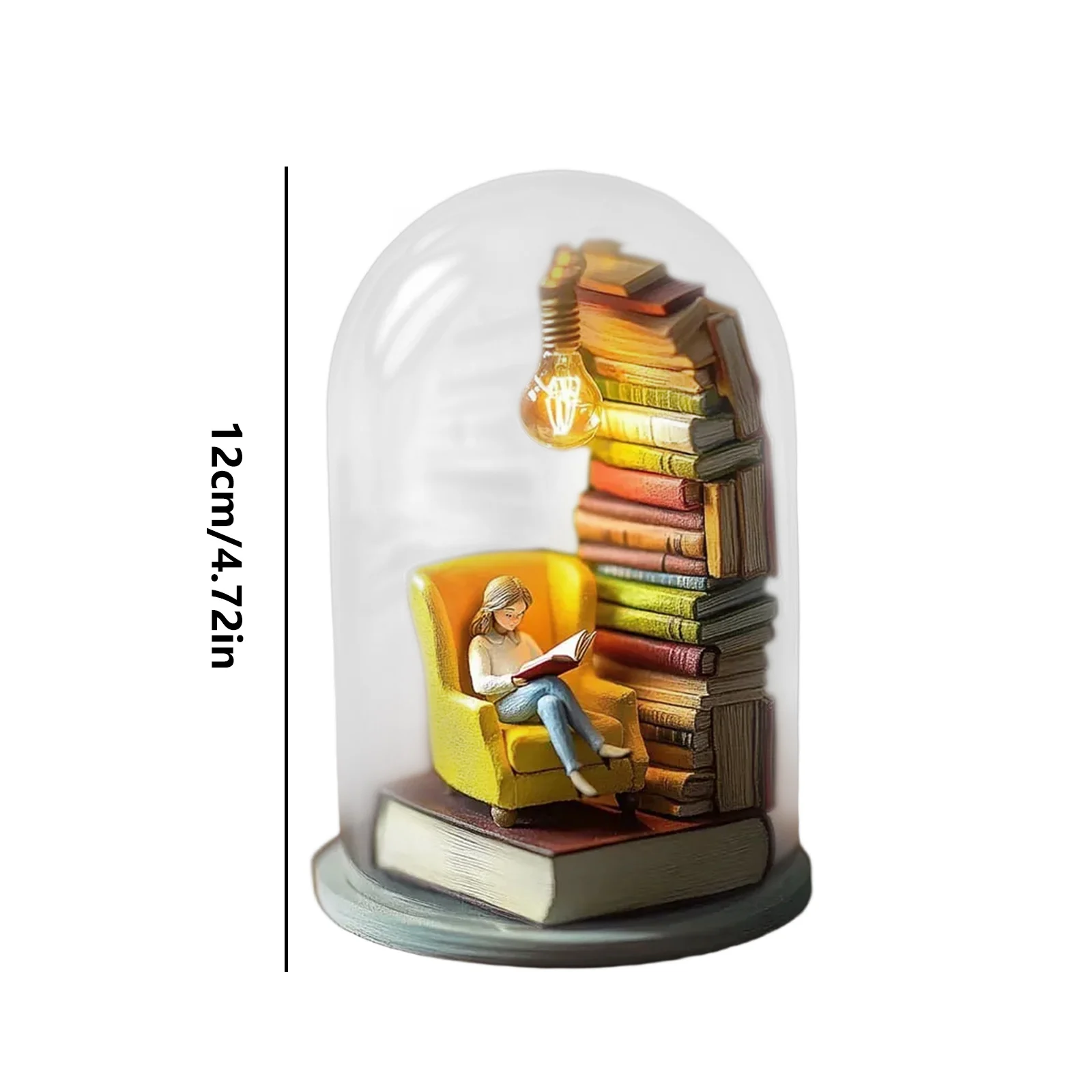 Design: This book lamp, housed in a glass shade, creates a tranquil reading world within. A character sits in a yellow armchair, absorbed in reading. A colorful collection of books sits beside them, a light bulb, creating a , artistic and creative atmosphere.